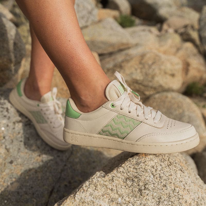 Beige et vertComposition : tige 100% coton biologique, tissage réalisé à la main en coton et polyester, doublure intérieure 100% coton bio, semelle intérieure amovible 20% PET recyclé et 41% EVA bio sourcé (canne à sucre) et 39% EVA conventionnel, semelle extérieure 70% caoutchouc naturel vietnamien et 30% synthétique, lacets 100% coton bio.