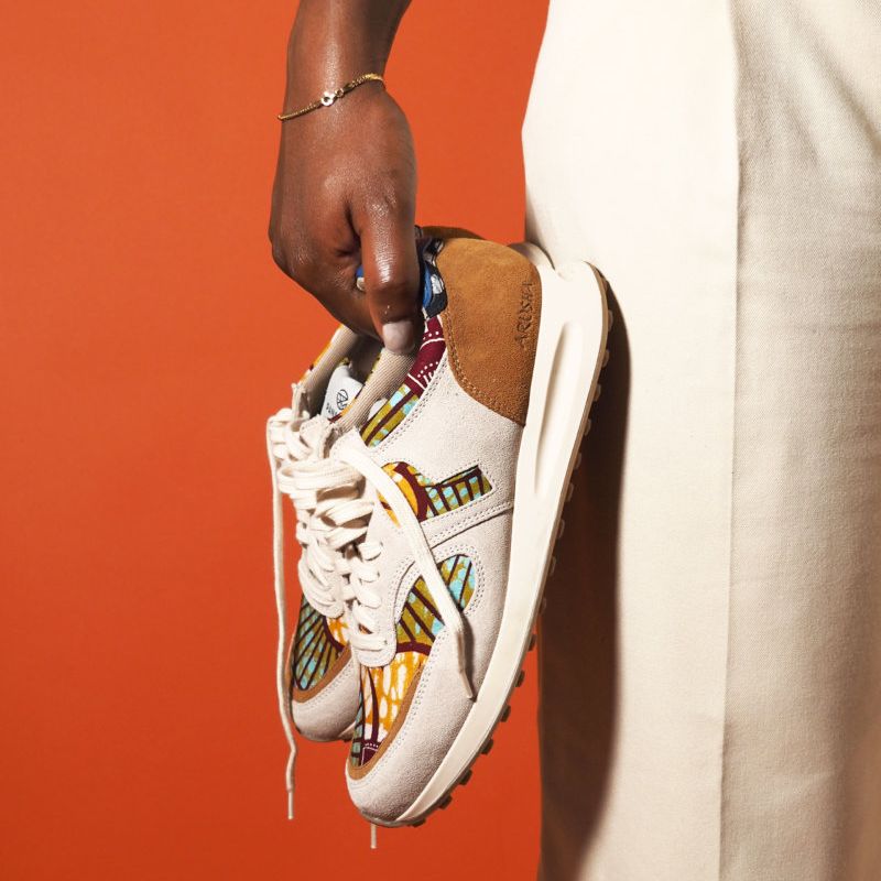 Vert et roseComposition : tige tissu wax 100% coton, cuir suède, doublure 100% polyester recyclé, semelle gomme, lacets 100% coton.
